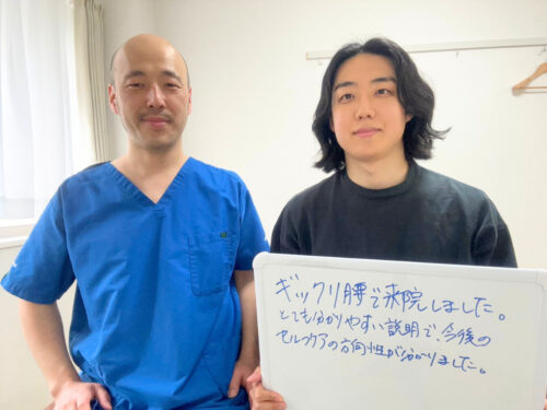 ギックリ腰で来院しました。体の使い方から教えて頂いて自分の体の動かし方を改めて考える事の大事さを少し理解しました。ありがとうございました。
